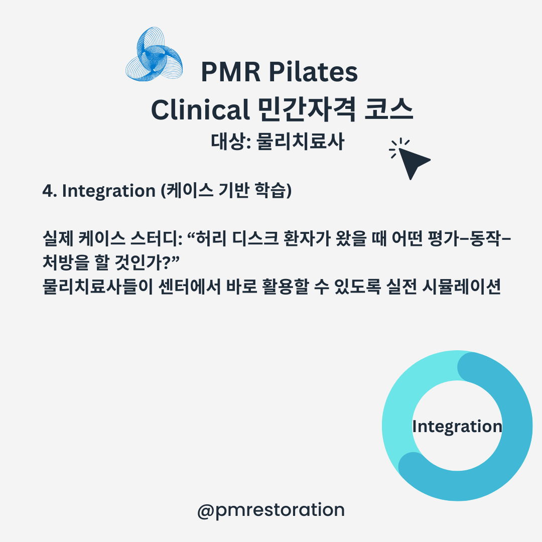 | 2주차 | 척추·골반 질환 중심 필라테스 | - 요통, 디스크, 골반 불균형에 대한 중재 전략 - 척추 안정화 접근 (Segmental vs Global) - 플로우 기반의 단계별 접근 |